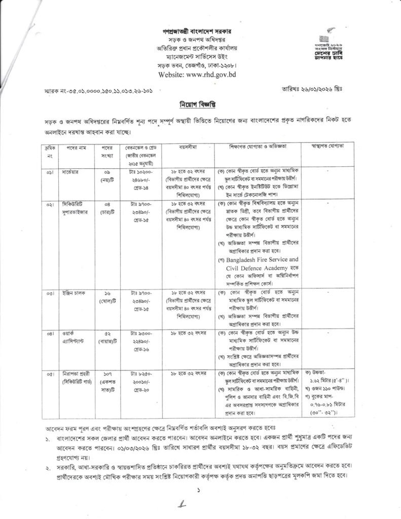 RHD জব সার্কুলার জারির তারিখ: ২৬ জানুয়ারি ২০২৬ ইং