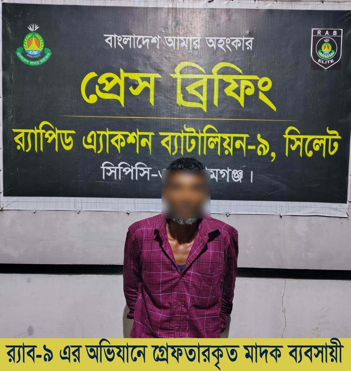 এরই ধারাবাহিকতায় র্যাব-৯, সিপিসি-৩, সুনামগঞ্জের একটি আভিযানিক দল সুনামগঞ্জ জেলার বিশ্বম্ভরপুর থানাধীন চিনাকান্দি বাজারে অবস্থানকালে গত ২৬/০৪/২০২৬ খ্রি. তারিখ আনুমানিক রাত ৯.৪০ ঘটিকার সময় গোপন সংবাদের ভিত্তিতে জানতে পারে যে, সুনামগঞ্জ জেলার বিশ্বম্ভরপুর থানাধীন ধনপুর ইউনিয়নের লক্ষীরপাড় এলাকায় কতিপয় ব্যক্তি মাদকদ্রব্য ক্রয়-বিক্রয়ের উদ্দেশ্যে অবস্থান করছে। উক্ত সংবাদ পেয়ে র্যাবের আভিযানিক দলটি আনুমানিক রাত ৯.৫০ ঘটিকার সময় ঘটনাস্থলে পৌঁছালে র্যাবের উপস্থিতি টের পেয়ে ০১ জন ব্যক্তি দৌড়ে পালানোর চেষ্টাকালে তাকে আটক করা হয়। আটককৃত ব্যক্তি জিজ্ঞাসাবাদে জানায় যে, তার হেফাজতে মাদকদ্রব্য বিদেশী মদ রয়েছে। পরবর্তীতে তার হেফাজতে থাকা ০১টি সাদা রংয়ের প্লাষ্টিকের ব্যাগের ভেতর থেকে ৪৬ বোতল বিদেশী মদসহ তাকে গ্রেফতার করা হয়। গ্রেফতারকৃত ব্যক্তি- মোঃ সবুজ মিয়া (৫১), পিতা- মৃত কালা মিয়া, সাং- চিনাকান্দি, থানা- বিশ্বম্ভরপুর, জেলা- সুনামগঞ্জ।